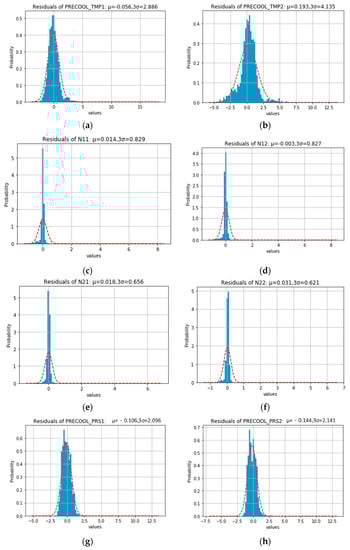 The residual probability distribution based on the Gaussian mixture model: (a) the residual probability distribution function of TMP1; (b) the residual probability distribution function of TMP2; (c) the residual probability distribution function of N11; (d) the residual probability distribution function of N12; (e) the residual probability distribution function of N21; (f) the residual probability distribution function of N22; (g) the residual probability distribution function of PRS1; (h) the residual probability distribution function of PRS2.