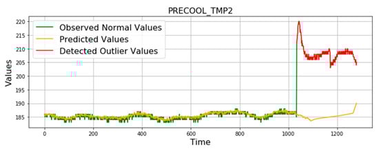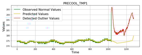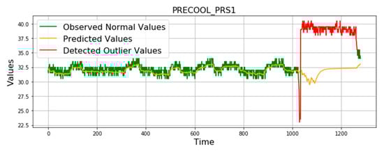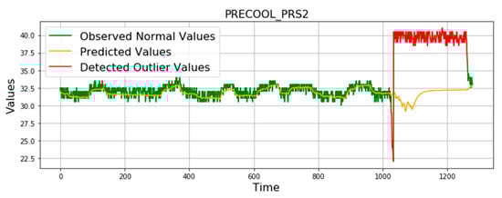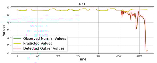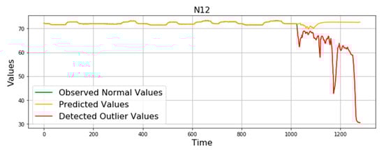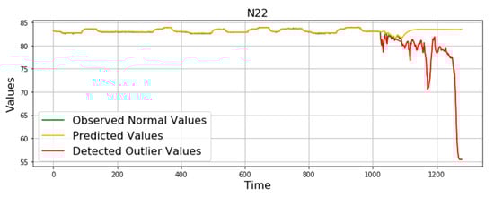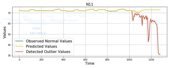 The anomaly detection results are shown in Figure 11, Figure 12, Figure 13, Figure 14, Figure 15, Figure 16, Figure 17 and Figure 18. The green curve represents the observed data, the yellow curve represents the curve predicted by multi-LSTM, and the red curve represents the abnormal value detected by the model.