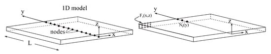 In the CUF framework, the cross-section of the beam is considered to be located on the x–z-axis of a generic Cartesian reference system, as shown in Figure 1. Beam boundaries along the y-axis can be defined in the range , where L is the length of the beam, see Figure 1. We next introduce the displacement vector