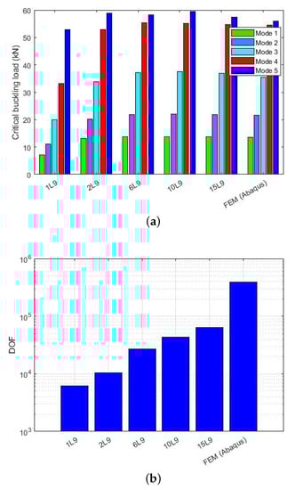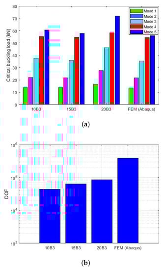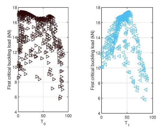 where the stress tensor is obtained by nine components related to as an identity matrix . Finally, global matrices are assembled in classical FEM. The critical buckling loads are determined as those initial stress states that make the tangent stiffness matrix singular; i.e., (refer to [45]).