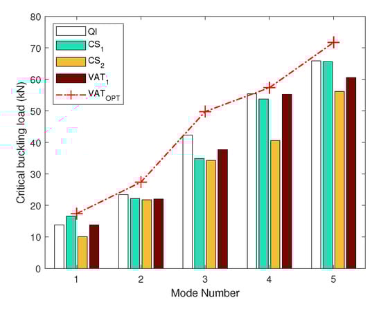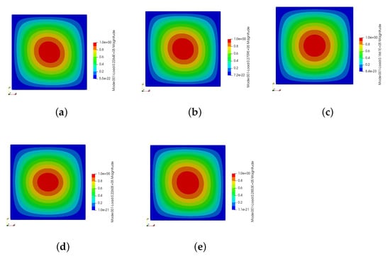 The optimum results obtained VAT laminates () with the layup , which indicated the maximum buckling load among the optimization procedures with respect to the initial buckling load based on ([44,51]) and classical laminates. The optimal design shows a small fiber angle () at the center of the laminates that extends to at the edges. The VAT laminate with an optimum fiber orientation angle is illustrated for various layup designs in Figure 8. improves its buckling load compared to classical composite laminates and . The first modes of the buckling load as well as the amount of displacement range also are shown in Figure 9, with different colors indicating different layouts. The first five buckling loads are shown in Figure 10.