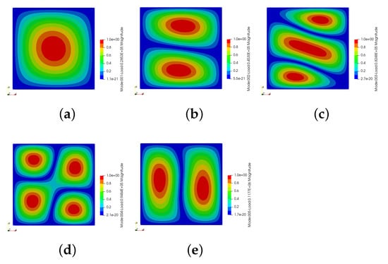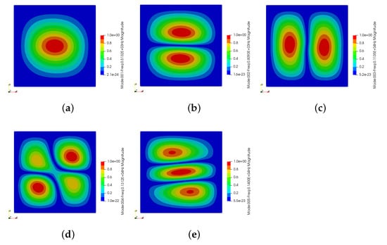 Based on the previous research [44], the same fully clamped plate of laminated VAT in free vibration analysis was chosen to study for the current evaluation: the optimization of VAT laminates through natural frequency analysis. Additionally, , , and (Table 2) were used to demonstrate the ability of the optimization procedure and structural analysis of CUF in the LW model. In this study, the mesh with on the cross-section was used. GA was applied to optimize the fiber orientation based on the highest first natural frequency. Contrary to the optimal results, the first natural frequency of different laminates is reported in Table 4. The first modal shape for different laminates is indicated in Figure 13. The optimal laminate has . This means that the start of has been reduced from at the center to at the edges of the VAT square plate. The five natural frequencies of the optimal laminates are shown in Figure 14.