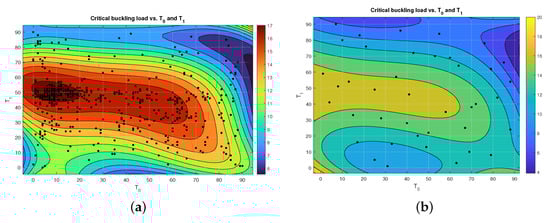 Contour plots and response surfaces based on GA and LHS for and as the variables and first critical buckling load as the response. (a) GA contour plot of variables’ sample points ( is represented by the colors). (b) LHS contour plot of variables’ sample points ( is represented by the colors).