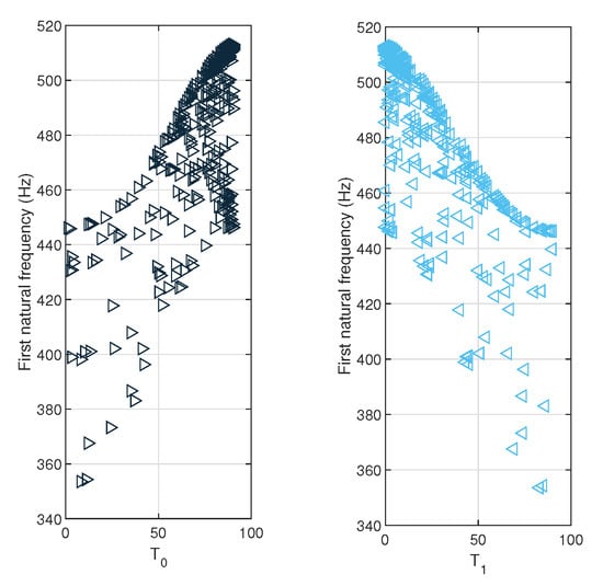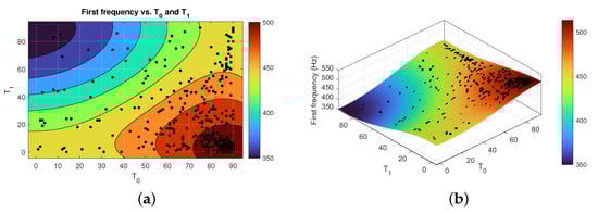 Bar plots in Figure 15 show the relationships between variable pairs and the first natural frequency. In Figure 15, plots show that both and are highly dependent on the first natural frequency.