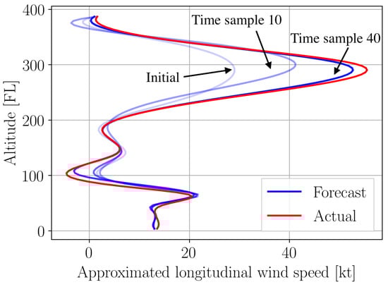 Before starting the descent, the initial spline approximating the longitudinal wind profile is generated by solving Equation (26) with data from a numerical weather forecast. During the execution of the descent, at each time sample the wind at the current altitude is measured and added to the set of wind observations. Then, weights are updated using the forgetting factor and problem Equation (26) is solved very quickly. This results in a new c, which allows the optimal trajectory to be updated according to a better estimation of the actual wind conditions either by solving the whole NLP optimization problem or by using parametric sensitivities (depending on the guidance strategy).