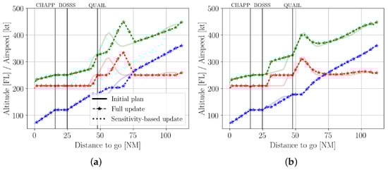 Figure 3a shows trajectory updates for perturbations in the control points of the spline approximating the wind profile. According to Figure 2, during the first part of the descent (from FL360 to FL200), the aircraft will encounter a tail wind that is significantly stronger than that reported by the initial wind forecast. Consequently, to keep the deviation from the CTA as small as feasible, the optimized trajectory update increased the aircraft’s descent rate between FL260 to FL200, thereby minimizing the impact of the significantly stronger than expected tailwind. To meet the speed constraint at QUAIL, the trajectory then leveled off the aircraft at FL200 to dissipate kinetic energy to 250 kts.