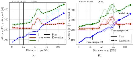 Figure 3b illustrates how the guidance strategy resolved the time error caused by the CTA being 30 s earlier than the original estimated time of arrival. The guidance strategy accomplished this by having the aircraft descend at a slightly faster rate to achieve and maintain the faster airspeed possible, while still meeting the path and terminal constraints for QUAIL and BOSSS listed in Table 1.
