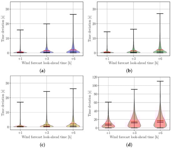 Time deviation at the metering/merging fix. (a) NMPC. (b) SbNMPC. (c) AsNMPC. (d) Open-loop.