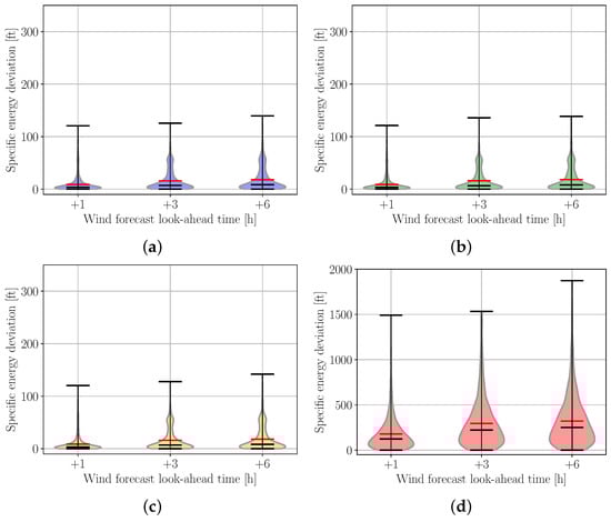 Similar results were observed for the specific energy error. According to Figure 6d, the metering fix could be achieved with specific energy errors up to 1800 ft by implementing the control of the initial optimal trajectory in open-loop. Conversely, guidance strategies based on NMPC achieved the metering/merging fix with negligible specific energy error, always lower than 150 ft and with a median value around 10 ft for a wind forecast of +6 h. In addition, the distribution of specific energy errors for the open-loop extends up to 1000 ft, while for any of the NMPC strategies this value is 75 ft.
