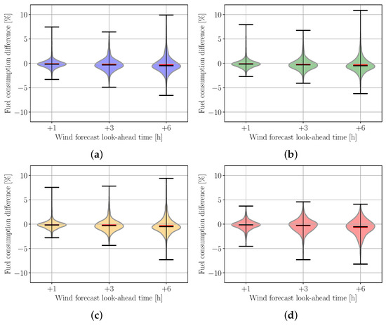Fuel consumption difference with respect to the initial plan. (a) NMPC. (b) SbNMPC. (c) AsNMPC. (d) Open-loop.
