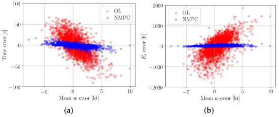 For the NMPC strategies, the time error appears to be weakly correlated with the mean longitudinal wind error; and the specific energy error is not correlated at all. The differences in the correlation patterns for the open-loop and NMPC guidance strategies are caused by the corrective actions performed by the latter, which repeatedly updates the optimal descent trajectory to satisfy the terminal constraints at the metering/merging fix while minimizing the environmental impact.