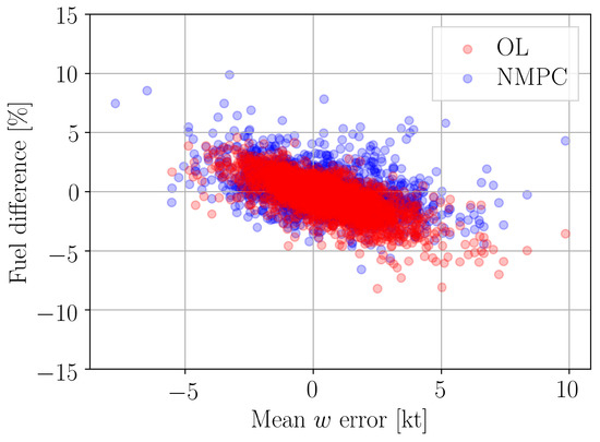 Figure 9 shows that the fuel consumption presents a negative correlation with the mean longitudinal wind error, meaning that the stronger the unexpected tail wind, the less thrust and fuel consumption are required if compared to the initial plan computed at the TOD. Remember that the open-loop strategy executes the initial control plan (i.e., thrust and flight path angle) without nullifying altitude nor speed deviations. For a given thrust value, however, the fuel flow changes with the altitude and the speed. Accordingly, the fuel consumption difference is caused by altitude and speed deviations from the initial trajectory plan. For the NMPC guidance strategies, these differences are also caused by trajectory updates that might modify the states and controls plans. For this reason, results for the NMPC guidance strategies show more dispersion.
