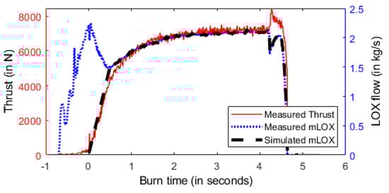 8]. Therefore, if using the measured LOX flow in the simulator, the LOX flow during this time is taken to be a linear rising LOX flow, from 0 at the beginning of chamber pressure/thrust rise to the measured LOX flow at what is deemed the LOX flow measurement stabilization point. After that, the simulated LOX flow is the measured LOX flow. In this case the simulated and actual measured LOX flow can be seen in