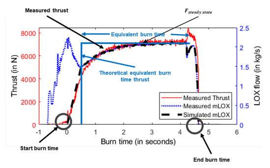 is found by looking at the thrust curve and visually evaluating when the start-up transient has ended, and thereby the steady-state level has been reached. The equivalent burn time is then the time the engine would be firing at this steady-state thrust level to achieve the measured total impulse. Mathematically, this is done as shown in Equation (