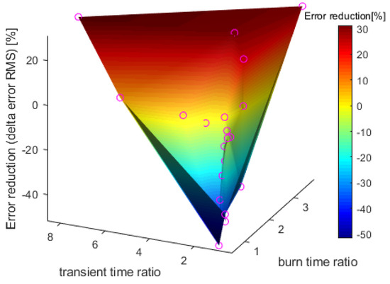 The above discussion shows that equivalent burn time can improve the error in regression modelling caused by start-up transients under certain conditions, namely when the simulated engine has a longer burn time and or shorter transient time than the engines used for the analysis. To concretize “longer” and “shorter” the effect on error RMS of each engine has been plotted in