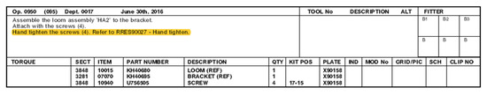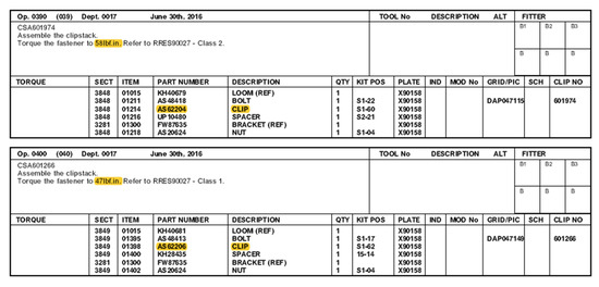The observation of the fitters on the shop floor highlighted that the errors were attributed to human error, as fitters had simply forgotten to tighten the bolt. As the processes of assembling harnesses involved some of them to “temporary” tighten the bolt, so that the harness slack can be adjusted, the fitters sometimes forgot to readjust the clip and tighten the bolt completely. This may have been because the clip seemed fully tightened to the fitter. It should be noted that this step of “temporarily” tightening the bolt is written in the corresponding SOP document. Figure 3 and Figure 4 provide some SOP examples that involve these steps for assembling the one component of the investigated part.