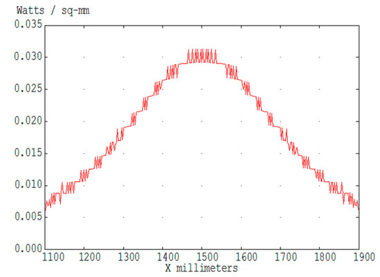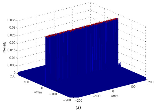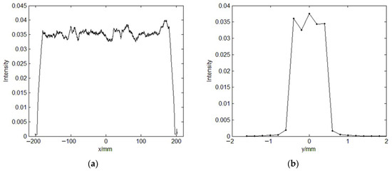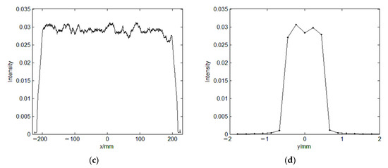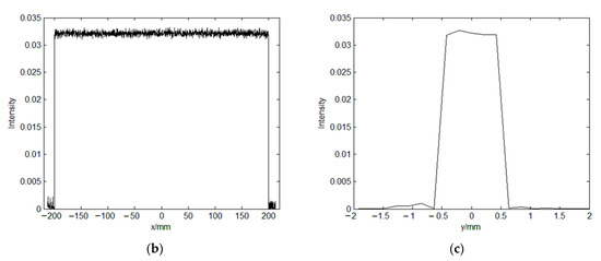 The intensity distribution of the sheet light is shown in Figure 8. It is worth noting the value of the light intensity in Figure 8. The energy in the input plane is equal to the energy in the output plane when energy loss is ignored during beam transmission.