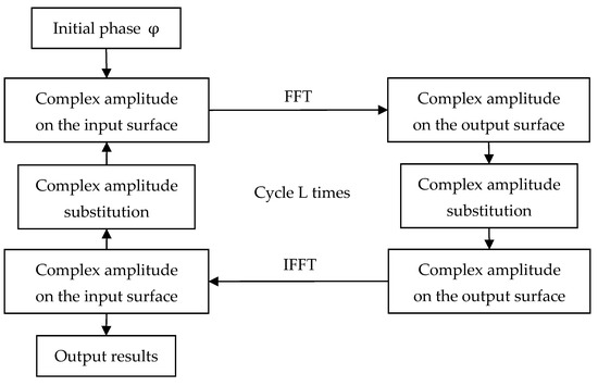 - Optimize the initial phase distribution with the iterative algorithm which is shown in Figure 5. After this calculation, a local optimal solution and its evaluation function can be found.