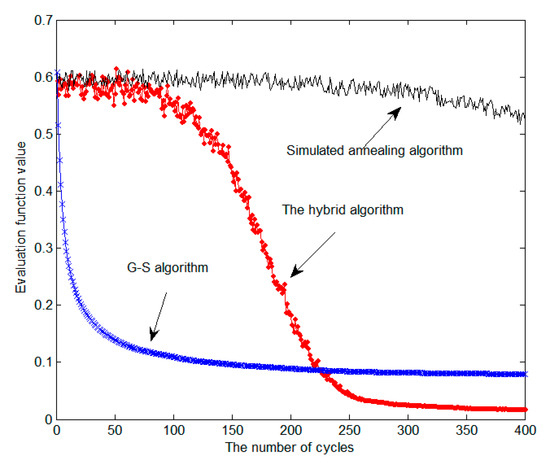 The hybrid algorithm is compared with the simulated annealing algorithm and G-S algorithm in Figure 6. The initial phase distribution is the same for comparison purposes. According to Equation (6), it is easy to know that the smaller value of the evaluation function, the better beam shaping effect. As shown in Figure 6, the convergence property of simulated annealing algorithm decreases slowly with the increasing cycles. However, the convergence property of G-S algorithm decreases too fast to stagnate. The convergence property of the hybrid algorithm is obviously better.