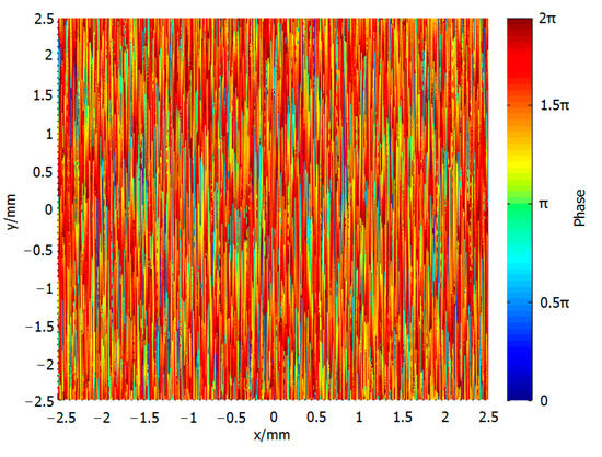 The phase distribution of the DOE, which is designed by the hybrid algorithm, is shown in Figure 7. DOE is composed of 4 million square tiny cells. The size of each cell is . Each micro cell has a definite phase value through hybrid algorithm optimization. Precise phase modulation can be achieved at each point of the light field through these micro cells.