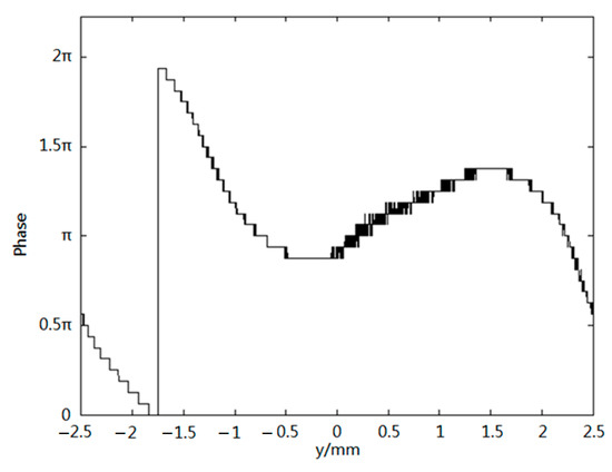 According to the 2nd section, the more steps are quantized, the closer the DOE surface shape is to the design shape, but the fabrication process will be more complicated. When the number of steps is 32, the DOE needs 5 times overlay fabrication. The phase values go from 0 to in increments of . The diffraction efficiency and non-uniformity of the sheet light approach the design value, and the fabrication difficulty is acceptable. Its performance is suitable for PIV experiments. Therefore, the DOE is quantified into 32 steps, as shown in Figure 9.
