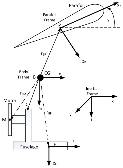 where m is the whole mass of the PPC vehicle, g is the gravitational constant, and IB is the inertia matrix of the PPC written in the body frame. The subscripts F, M, and P refer to the fuselage, the motor, and the parafoil, respectively.