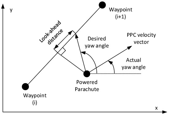 To move the PPC through waypoints, the look-ahead guidance technique is used, as illustrated in Figure 4 [7,16].