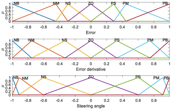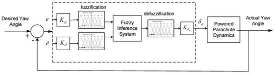 The structure of the proposed fuzzy controller for the lateral PPC motions is shown in Figure 5. The FLC has two inputs, the error and the error derivative, and the output is the parafoil steering angle.
