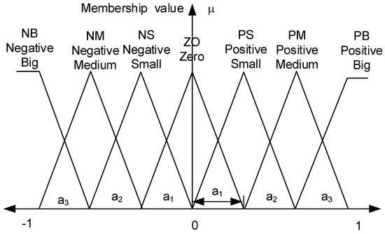 Selecting the number and distribution of membership functions (MFs) for the inputs and outputs comprises the first steps in the FLC design. Seven normalized membership functions with triangular shapes were studied in this paper; see Figure 6 [8]. To describe these functions, the location of the vertices of the triangles must be determined. Only two parameters (a1 and a2) are needed for each variable.