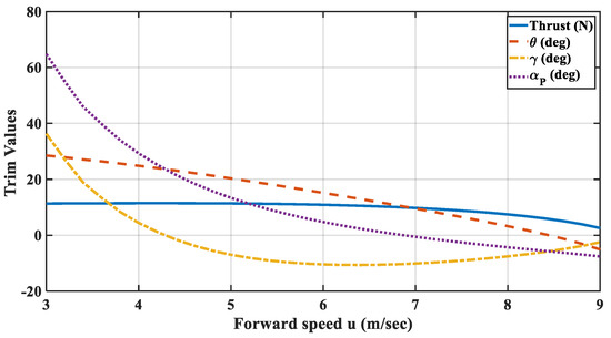The equilibrium points for the steady-state level flight as a function of the PPC forward velocity were determined and plotted, as shown in Figure 7. Stability was evaluated by determining the eigenvalues of the linearized models around these equilibrium points. Below u = 2.6 m/s, the equilibrium points could not be achieved, and the system became unstable above u = 7.3 m/s.
