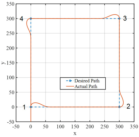 For the simulation, the vehicle started at x = y = 0 with a heading angle ψ = 90 deg, the look-ahead distance was 5 m, and it was assumed that the vehicle would reach the waypoint within a circle of 2 m radius.