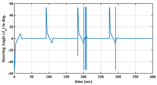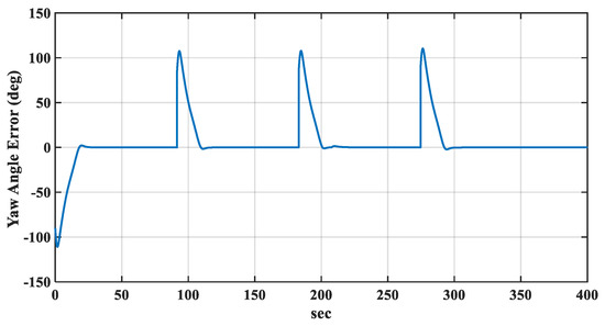 The maximum allowed steering angle of the parafoil angle was 60 deg, and the maximum allowed rate for the yaw angle was 0.05 rad/sec. With an equally spaced distribution of the fuzzy membership functions (i.e., ), the trajectory of the PPC moving through four waypoints was found to be shown as in Figure 8. The simulation indicated that the proposed FLC was able to allow the PPC to smoothly navigate through the waypoints. The time history of the error between the desired and actual yaw angles is shown in Figure 9. The error exponentially converged to zero in a short time. The steering angle for this maneuver is shown in Figure 10. The peaks were mainly due to the abrupt changes in the error derivative.
