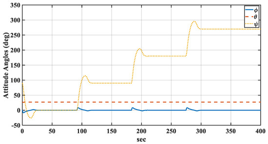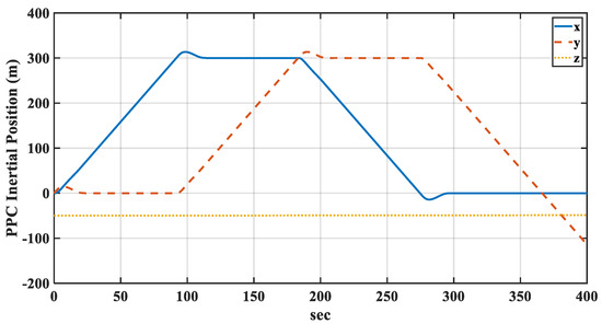 The time histories of the PPC inertial position and attitude angles are shown in Figure 11 and Figure 12, respectively. The altitude and pitch angles were used as constants to verify that the longitudinal and lateral motions were completely uncoupled.