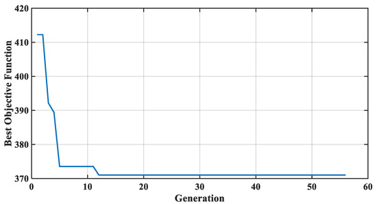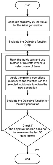 To improve the controller’s performance, GA was used to tune the MF distributions according to the algorithm shown in Figure 13. The GA parameters were set to 20 for the population size, 0.7 for the crossover rate, and 0.01 for the mutation rate. In this algorithm, the individuals that generate the offspring who join the next generation are chosen using linear ranking with the roulette wheel approach; when the objectives function has not improved in the last 30 generations, the algorithm ends [14,17].