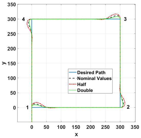 To study the robustness of the proposed FLC, the aerodynamics properties of the parafoil that are related to the lateral motion were changed and the simulations were repeated. Increasing these coefficients by doubling their values improved the effectiveness of the parafoil in controlling the lateral movement, while decreasing these coefficients to half of their nominal values slightly degraded the performance of the system, as shown in Figure 17. In both cases, the proposed FLC performed well, and we observed small increases in the overshoot and settling time in the second case when the aerodynamic coefficients were decreased.