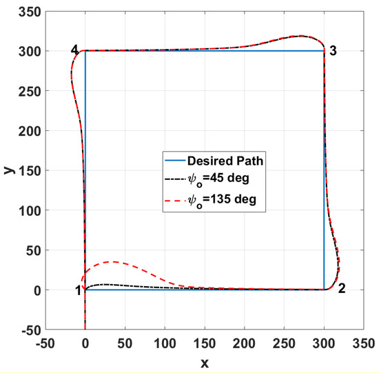 Figure 18 shows the performance of the designed controller with different initial conditions of the flight direction. It is shown that the controller was able to steer the vehicle to its desired direction, even it was initially flying in the opposite direction.