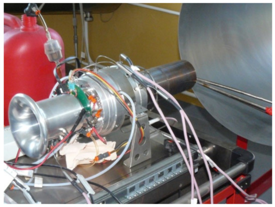 The GTM-140 microturbine (Figure 2) consists of a single-stage radial compressor, driven by a single-stage axial turbine, and an annular combustion chamber with a set of evaporators. It operates in the range of 33,000–120,000 rpm and can produce take-off thrust up to 140 N. The tested variant of the microturbine played the role of a combustor rig and was devoid of a converging nozzle. For this reason, the generated thrust was limited to 70 N, and consequently SFC values were high (above 200 kg/kN/h). However, in this work, the absolute values of the parameters were less important than their relative changes in response to the increased biocomponent ratio.