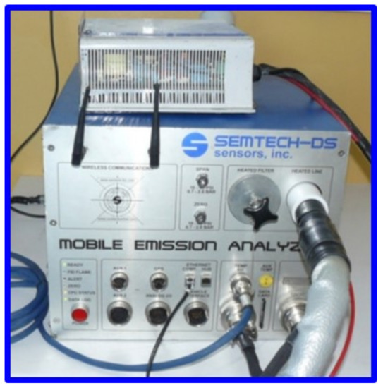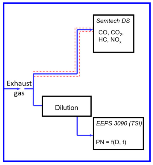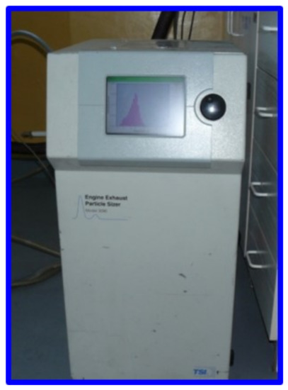 The test bench is equipped with a portable GA60 gas analyzer (Figure 3) which was used in previous emission research [26,27,28]. Exhaust gases are sampled from the engine nozzle using a probe and delivered through a heated exhaust hose to the instrument. The analyzer is equipped with electrochemical sensors to measure O2, CO, NO, NO2, SO2 gases and two NDIR (nondispersive infrared) sensors for infrared measurement (CO2 and CH). The exhaust gas components are measured with the resolution of 0.1 ppm and uncertainty of 5%. The analyzer also enables the measurement of exhaust gas temperature through a thermocouple built inside the probe. Operating parameters and emissions are presented and stored by the data acquisition system developed in LabVIEW [29] Additionally, the Semtech DS gaseous analyzer (Figure 4) and Engine Exhaust Particle Sizer (EEPS 3090, Figure 5) operated by Poznan University of Technology were used with a respective exhaust sampling system (Figure 6). Exhaust gases were introduced to the Semtech DS analyzer through a probe maintaining the temperature of 191 °C and the exhaust sample was directed to the flame-ionizing detector (FID) where HC concentration was measured. Then the sample was cooled down to temperature of 4 °C and the concentration measurement of NO (NDUV analyzer), CO, CO2 (NDIR analyzer) was performed. In the following sections, raw emission results expressed in ppm or percents are presented.
