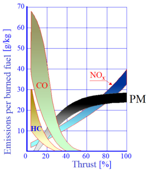 Engine emissions significantly depend on its operating mode (Figure 9), so they are tested in selected operating points that belong to the Landing and Take-Off cycle (LTO), according to the ICAO procedure [30]. Engine test steps correspond to the following operating modes: takeoff, climb, cruise, approach and taxi/ground idle. The tests performed on both types of engines consisted of a series of operating points, where the speed was increased in subsequent steps (Figure 10). Performance parameters and emissions were measured and averaged over 30 s for the microturbine and 60 s for the turbojet. The parameters are presented versus thrust which better represents LTO operating modes.