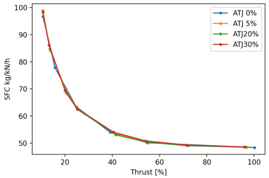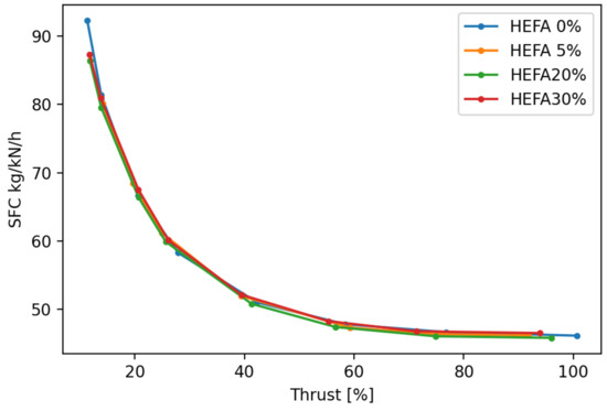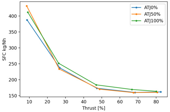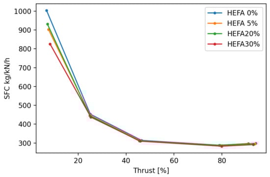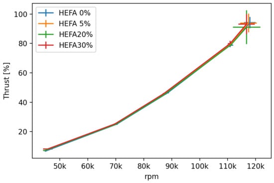Based on the collected performance data of the DGEN 380 turbofan, it can be concluded that the relative differences in thrust (Figure 23 and Figure 24) and fuel consumption (Figure 25 and Figure 26) between the tests are usually less than 1%. The biggest ones are for the take-off range, but they do not exceed 5% (Figure A1 and Figure A2). They are more related to the testing and engine control methods than to the used fuel blend.