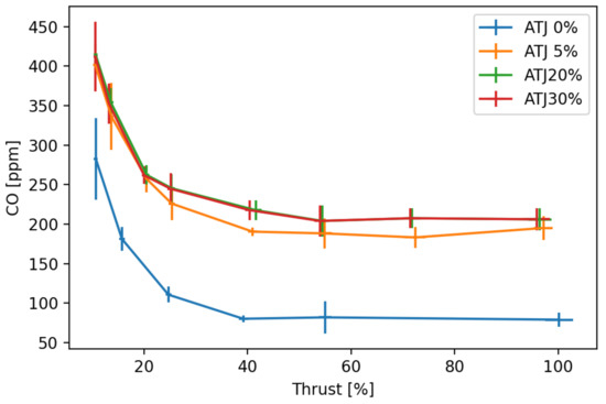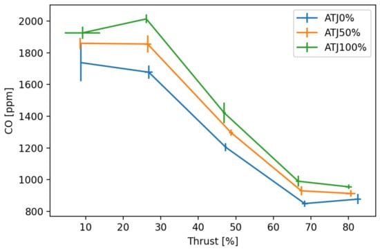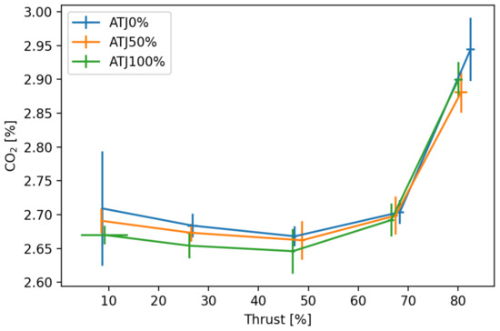 During engine tests, the operating parameters such as thrust (Figure 11) and SFC (Figure 12) remain stable, with insignificant differences between tests. Plots below (Figure 13, Figure 14, Figure 15 and Figure 16) present the CO, CO2, HC and NO emissions of engine fuelled by blends with increasing ratio of the biocomponent (Jet A-1, 50% blend of Jet A-1 with the ATJ component and neat ATJ component). Values are averaged for 30 s while error bars show the triple standard deviation from the mean.