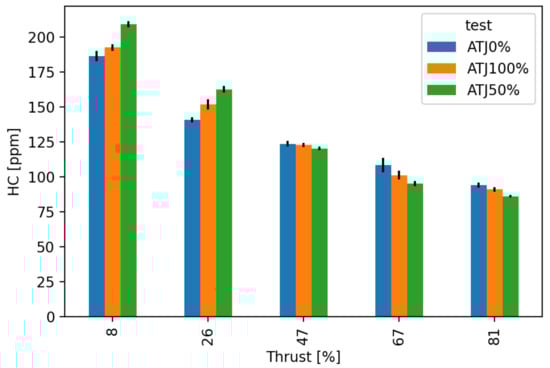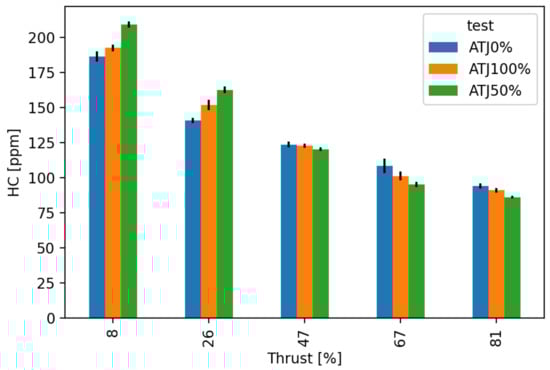 In the case of HC emissions (Figure 15), the change in emissions of this parameter with the addition of the ATJ component is not conclusive. At the first two rotational speeds, an increase in HC emissions was obtained after adding the ATJ component in relation to Jet A-1. At three successive operating points, the addition of the ATJ component resulted in a decrease in HC emissions for the Jet A-1 fuel.