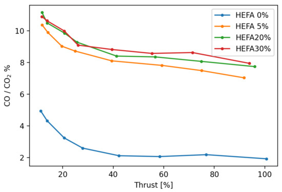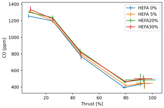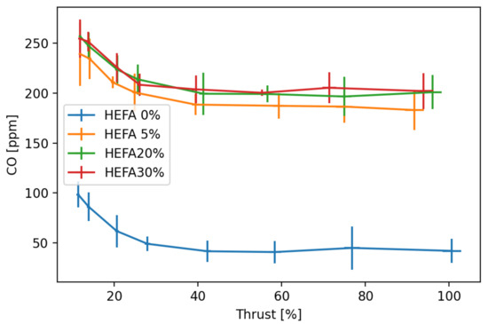Emission-wise, adding the ATJ component to the mineral fuel resulted in a clear increase in CO emissions (Figure 29) and a slight increase in CO2 emissions (Figure 30) in all the analysed operating points of the DGEN 380 turbofan. The formation of CO is related to incomplete combustion of the fuel, so this process is more apparent when running on a DGEN 380 engine for blends with the ATJ component. In the case of the HEFA component, its addition resulted in a clear increase in CO emission (Figure 31), a slight increase in CO2 emissions (Figure 32) in all analysed operating points.