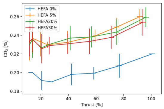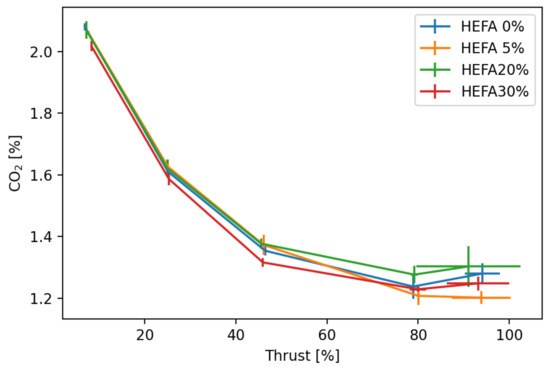 Interestingly, the absolute emission values are almost twice as high for ATJ as for HEFA. Relatively low numbers of the CO2 emissions for both biofuels are due to the dilution of the exhaust gas. It corresponds to the distance between the measuring probe and the engine, which was chosen in relation to the diameter of the outlet nozzle. Placing the probe in close proximity to the engine would make the results more uncertain. In particular, directing the gas stream directly at the probe makes it impossible to take a sample, as the turbulence around the probe caused by high dynamic pressure disturb the measurements.