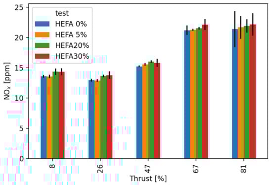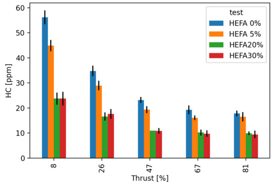 Similarly, the test-runs with HEFA blends did not affect significantly engine performance (Figure 17 and Figure 18). Adding the HEFA component to aviation fuel causes an increase in CO emissions (Figure 19) in all analysed operating points while CO2 shows no clear trend (Figure 20). In terms of NO emissions, a similar direction of changes for this parameter was obtained, that is, the HEFA component generally increases NO emissions (Figure 21). The reverse trend was obtained for the emissions of hydrocarbons (HC, Figure 22). Adding HEFA component resulted in decrease in HC emissions in relation to pure Jet A-1 fuel.