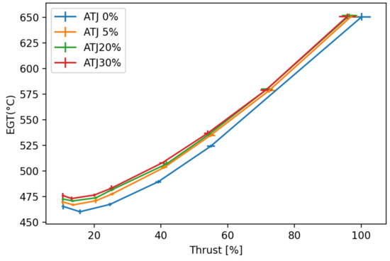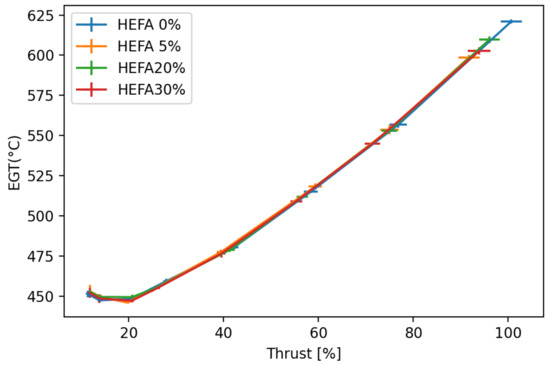 When analysing the operating parameters, there is no clear trend of their change due to the use of blends with biocomponents. To associate the differences with some fuel characteristics, the model of engine and its control system is necessary. For example, when using ATJ, a slight increase in exhaust gas temperature (EGT) was observed with the increasing ratio of the biocomponent (Figure 27), but a similar trend was not observed for HEFA (Figure 28).