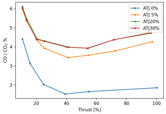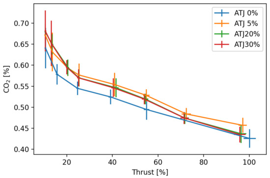 The results show that the addition of the ATJ component caused an increase in CO emissions compared to the Jet A-1 aviation fuel in all operating points (Figure 13). The greater the proportion of ATJ in the mixture, the greater the increase in CO emissions. In terms of CO2 emissions (Figure 14), ATJ component causes a slight decrease in CO2 emissions in relation to the neat Jet A-1 fuel.