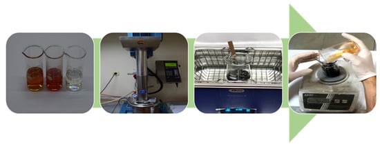 The epoxy resin was mixed with the reactive diluent and the MWCNTs, and the mixture was pre-heated at 55 °C into a glass borosilicate beaker. Then, the mixture was stirred mechanically using a Dispermat Dissolver VL1 (VMA-Getzmann, Brüchermühle, Germany) for 20 min at 2000 rpm in a vacuum to homogenize the mixture and disperse the MWCNTs into the resin. Similarly, the hardener was heated to 55 °C and was degassed in a vacuum. The epoxy mixture was placed into an ultrasonic bath (Elmasonic P, Elma Schmidbauer GmbH, Singen, Germany) at 65 °C for 20 min in order to improve the MWCNTs dispersion. Then, an additional degassing was performed from the epoxy mixture and the hardener using ultrasonics. After the recovery of the epoxy mixture and the hardener to the room temperature, the two components were mechanically mixed inside the ultrasonic bath for 10–15 min. The synthesis process of the MWCNT-filled adhesive is illustrated in Figure 1.