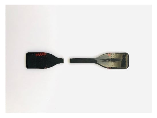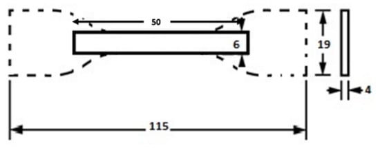 The tension tests were conducted according to the ASTM D638-14 standard using a Tinius Olsen tensile tester with a load cell of 5 kN. The type-IV dog-bone samples were used. The sketch and dimensions of the dog-bone tension sample are also shown in Figure 2 with the dashed line. The tests were conducted at a loading rate of 1 mm/min. Five specimens were tested in total.