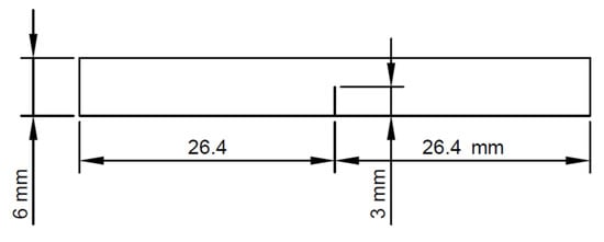 For the characterization of the Mode-I fracture toughness of the aged epichlorohydrin/cardanol adhesive, single edge notched bend (SENB) samples were used. The geometry and dimensions of the SENB samples are shown in Figure 3. The width of the specimens was 3 mm. The tests were conducted according to the ASTM D5045-14 standard using a Tinius Olsen machine. Prior to the tests, a 3 mm pre-crack (notch) has been created on the specimens using a razor-sharp blade placed on the machine’s grip and applying a relatively slow load rate (0.1 mm/min). In total, three specimens were tested using a 1.0 mm/min loading rate.